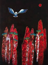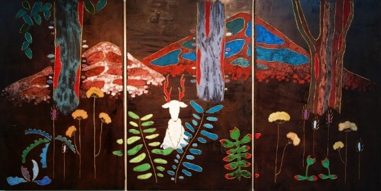 夏老師的作品外顯形式多以大自然為題材,這些年因常往返國外駐村,如:舊金山、紐約、日本、羅馬尼亞等的特殊經驗,其間所遇見的神秘體驗為創作來源:像是在美國舊金山時,夜半搭肩的鹿、守護她的狼群、以及危急時拯救他的貓頭鷹;在下著雪的紐約,前來陪伴,給予安慰的溫暖瓢蟲;在日本上高地的寒冬森林中,不可思議與她相遇的紅色青蛙;東京新宿的小男孩;在羅馬尼亞看見的紅色月亮等等的生命奇遇。也有日常生活中帶來的感悟與啟發:像是漆紅麻布的紅塵系列;以及看起來雖然並不驍勇,但卻努力戰鬥著的戰士們。可見夏老師對於外在環境波動的敏銳察知,以及內在對自我的覺察,作品也鼓勵觀者永不放棄,讓靈魂靈性和思維展現光亮。