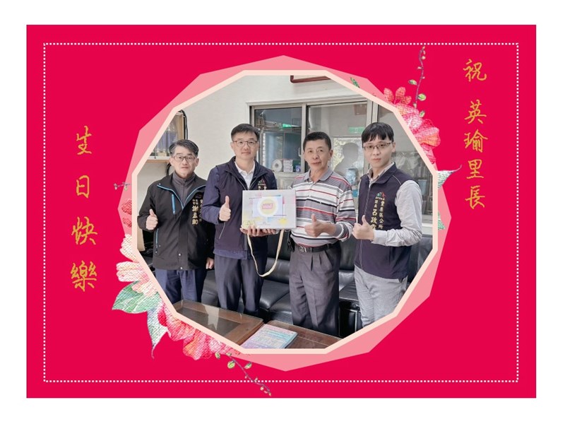 本(2)日,豐原區公所 #洪峰明 區長 #謝孟助 主任秘書民政課#呂政霖 課長一同代表 #臺中市政府 #盧秀燕 市長 #臺中市政府民政局 #吳世瑋 局長,致贈 #中陽里 #黃英瑜里長 生日禮盒 ,祝福里長生日快樂感謝 #英瑜里長 對市政的推動及本所業務的大力支持 誠摯祝福里長平安健康事事順心