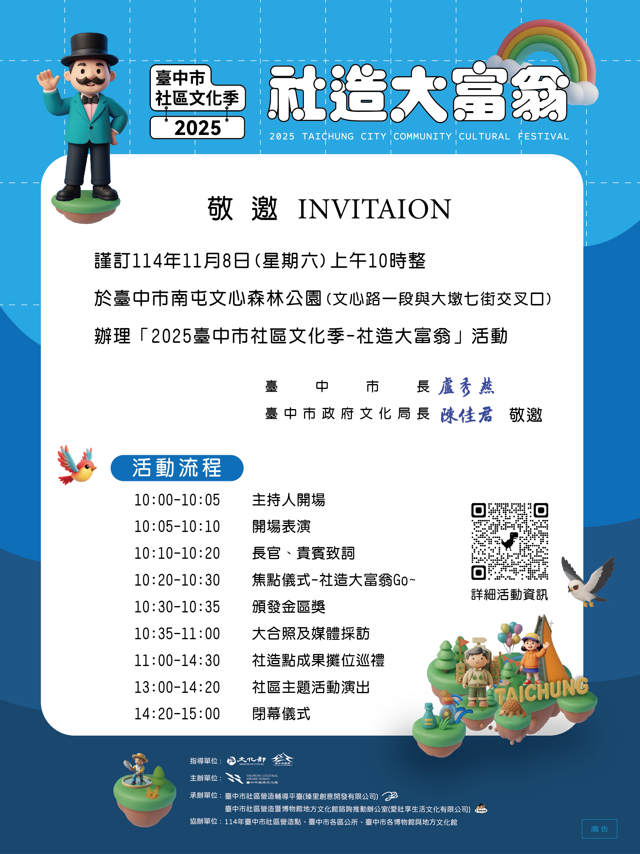 一、臺中市文化局為展現臺中市社區營造成果,串聯114年度社造點、各區公所、社區大學等,共同呈現社區的主題特色,訂於114年11月8日(星期六)上午10時至15時假本市文心森林公園南側溜冰場(文心路一段與大墩七街交叉口)舉行「2025臺中市社區文化季-社造大富翁」活動,歡迎踴躍參加。