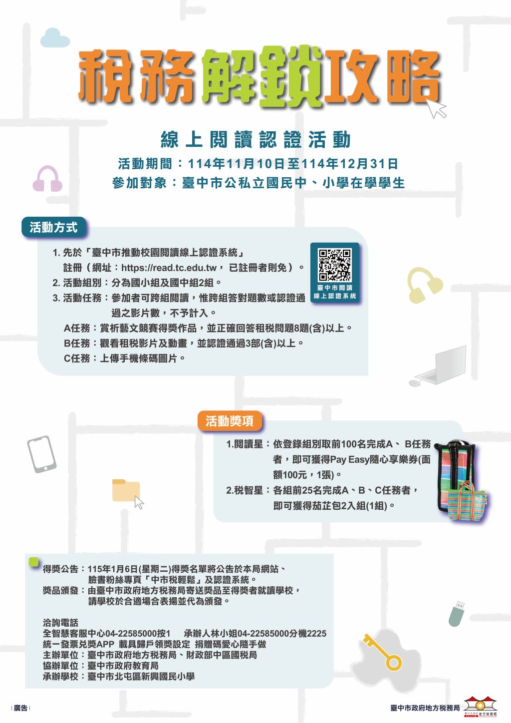 臺中市政府地方稅務局舉辦「稅務解鎖攻略」線上閱讀活動,自114年11月10日起至114年12月31日止,登入「臺中市推動校園閱讀認證系統」(網址:https://read.tc.edu.tw)後,進入活動頁面,完成指定任務,前100名完成任務者就可拿好禮,活動詳情請見活動宣傳單或至臺中市政府地方稅務局網站查詢!